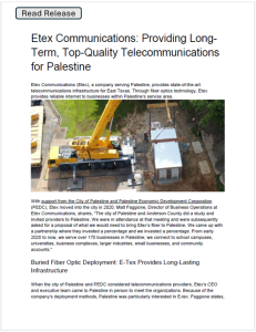Etex and the Palestine Economic Development Corporation enter into a public private partnership to bring high speed fiber Internet to the City of Palestine Texas.