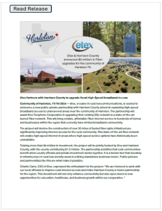 Etex and Harrison County enter into a public private partnership to bring high speed fiber Internet to the City of Harleton Texas.